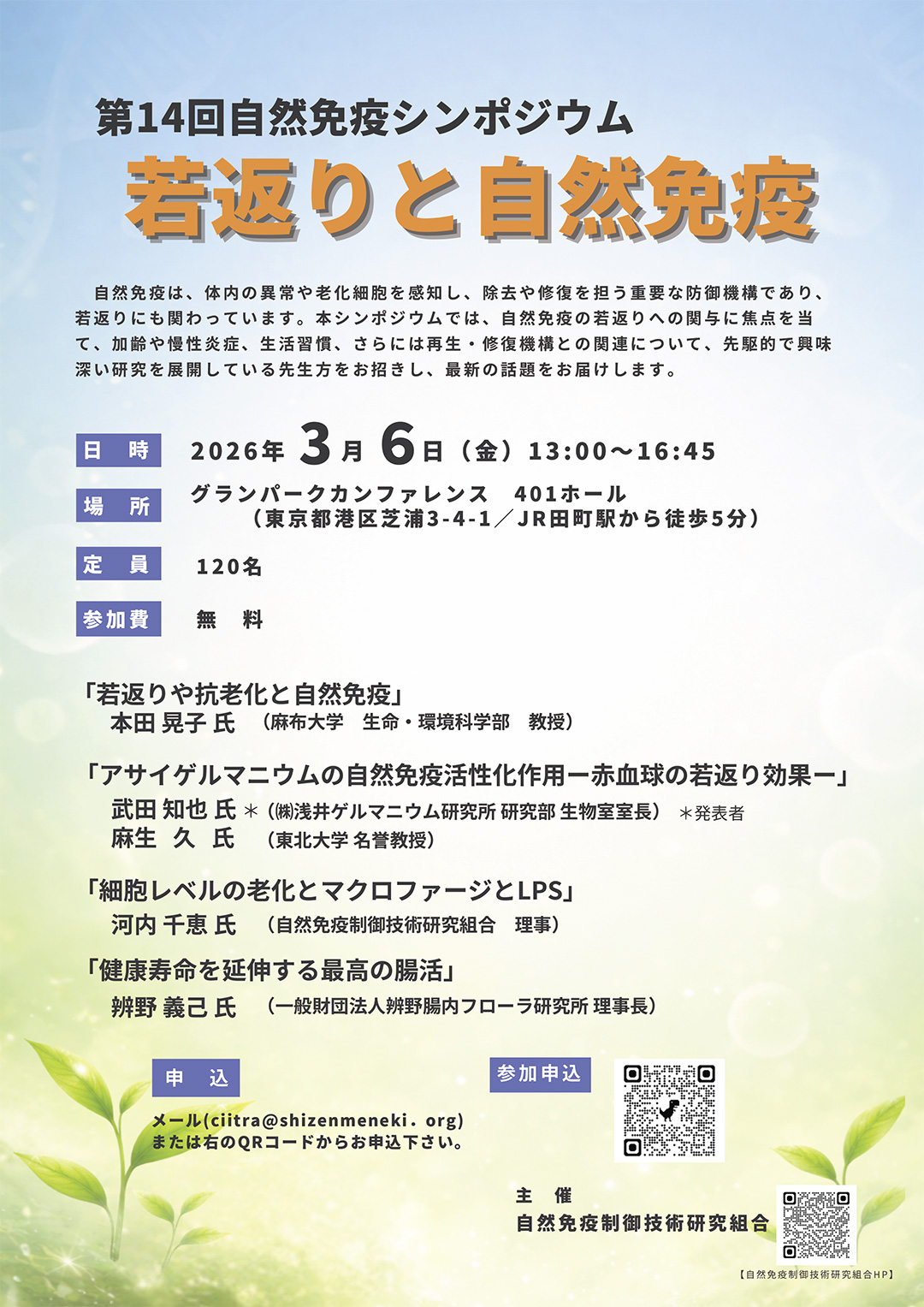 シンポジウム 過去のアーカイブ 過去のアーカイブ 2026年 2025年 2024年 2023年 2022年 2021年 2019年 2018年 2017年 2016年 2015年 2014年 2013年 2011年 2026年 第14回シンポジウム「若返りと自然免疫」 2025年 第13回シンポジウム「認知機能と自然免疫」 2024年 第12回シンポジウム「アンチエイジングと自然免疫 Part2」 2023年 第11回シンポジウム「アンチエイジングと自然免疫」 2022年 第10回シンポジウム「環境・常在細菌と自然免疫 Part2」 2021年 第9回シンポジウム「環境・常在細菌と自然免疫」 2019年 第8回シンポジウム「未来志向の次世代食品機能性と自然免疫」 2018年 第7回シンポジウム「次世代食品機能性と自然免疫 PART2」 2017年 第6回シンポジウム「次世代食品機能性と自然免疫」 2016年 第5回シンポジウム「食品機能性と自然免疫」 2015年 第4回シンポジウム「健康と自然免疫」 2014年 第3回シンポジウム「食と自然免疫」 2013年 第2回シンポジウム「自然治癒力と自然免疫」 2011年 第1回シンポジウム「自然免疫、その新展開」